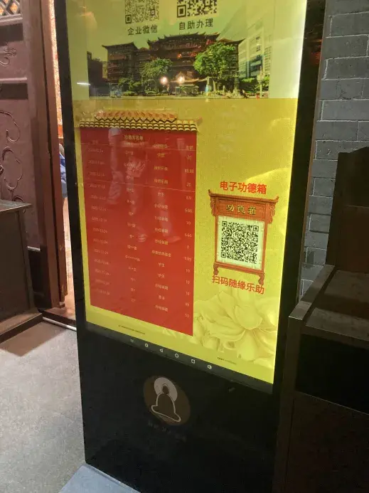 そして面白かったのはこれ。中国はものすごい勢いでキャッシュレス社会になっているがこれもキャッシュレスお賽銭箱。しかもお賽銭を投げるとリアルタイムで誰がいくら入れたかわかるという無駄にハイテクなシステム。時代は進むんだなあ…
