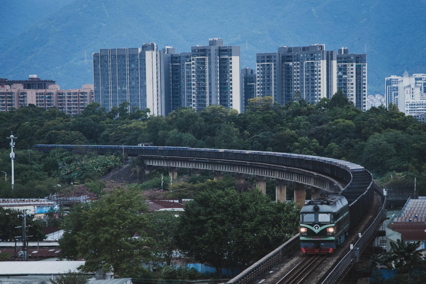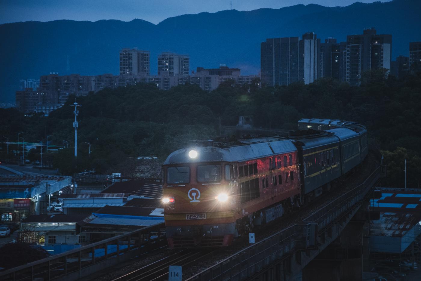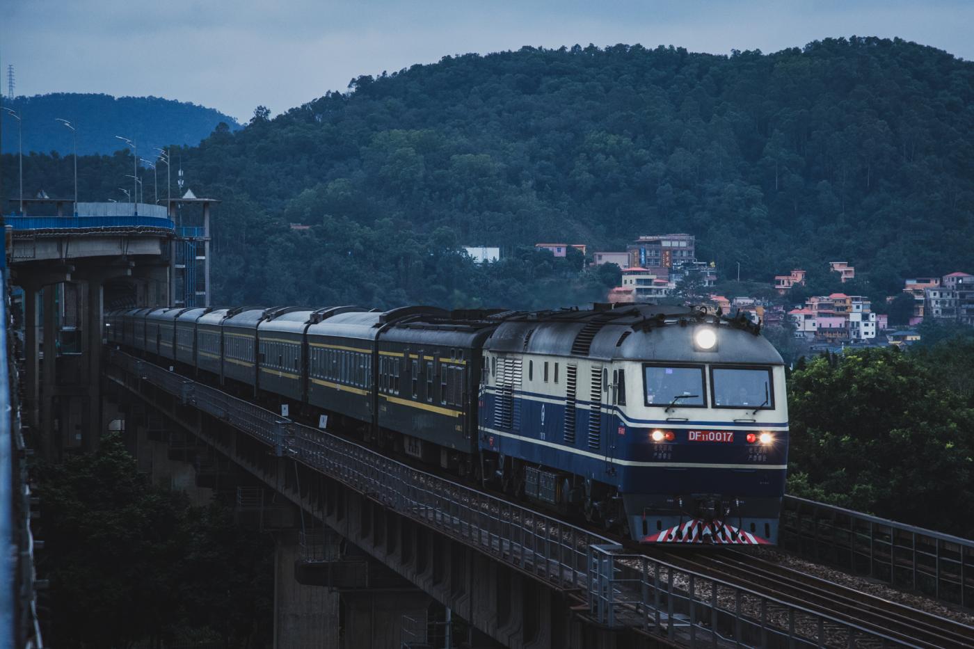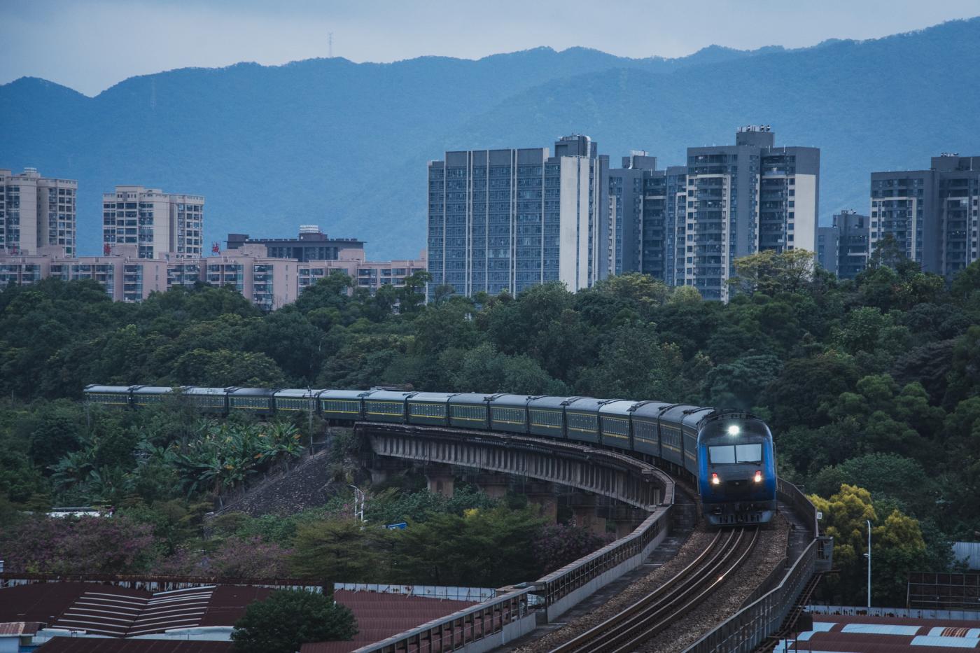 そして露出が落ちてもうギリギリ…の時間にやってきたのが深圳東発の靖西行、快速K949次。運行時間が短いこともあってか、編成も全体的に短め。
