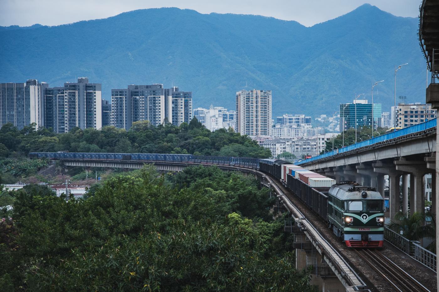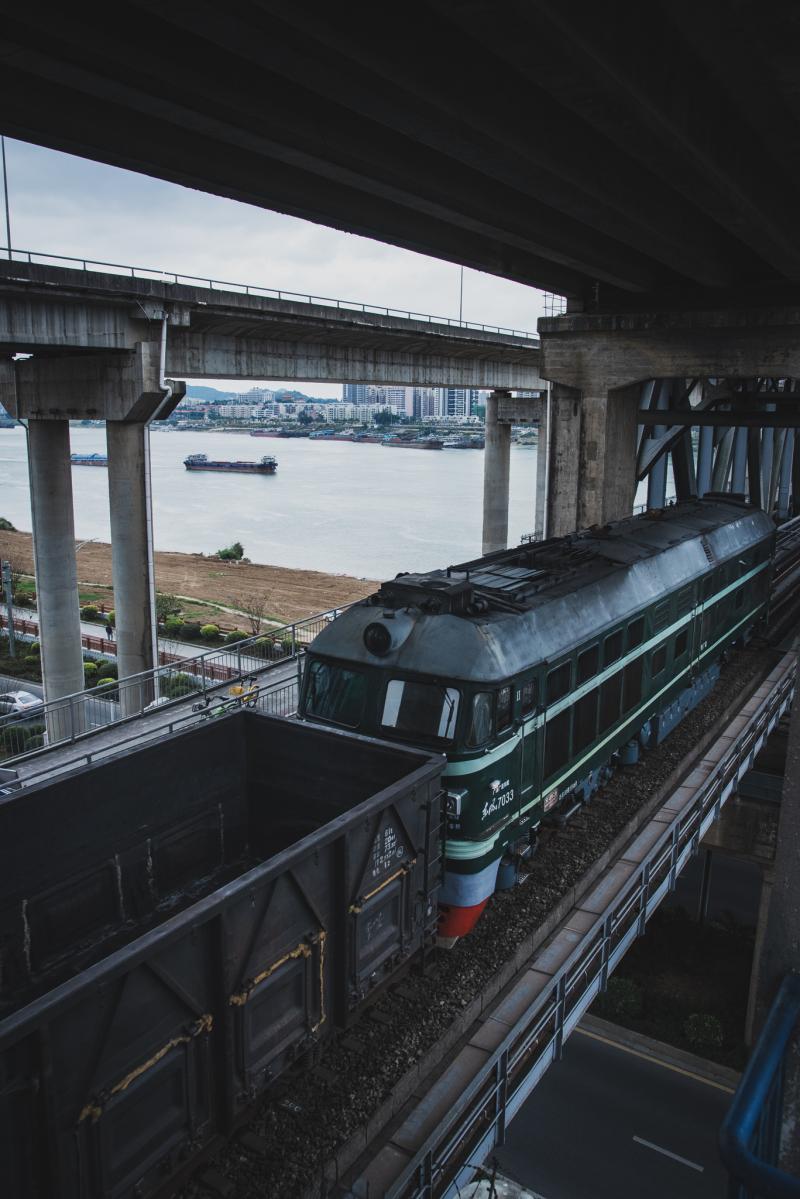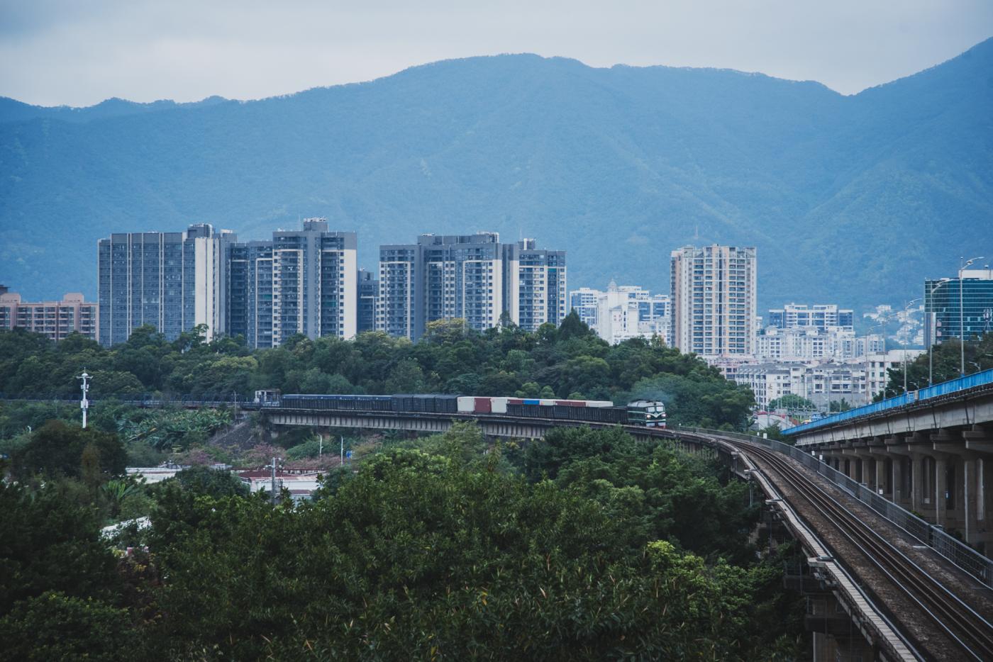 ぼーっと外を眺めていると眼下に貨物列車が!カメラはカバンの中だったのでスマホでとっさに撮影。これが中国の鉄道か。