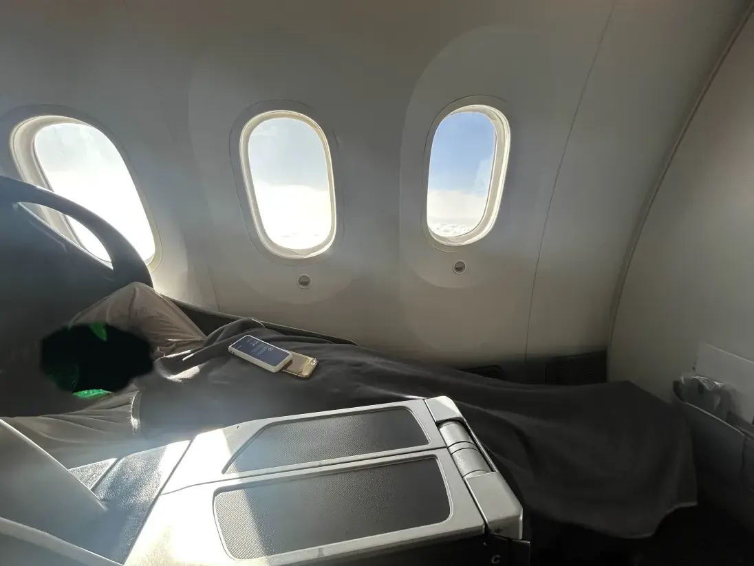 この画像、爆睡する著者近影なのだが窓3列分を使用して横になれるあまりの贅沢に感激、ご飯後に気持ちよく寝てしまった。いつもならビビる上空の揺れもなんのその。ゆりかごに揺られているような感じさえ覚えた。もうエコノミーには戻れねえ…
