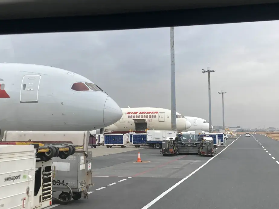 沖には3機の787がとまっており、前からアメリカン航空、エア・インディア、そしてJALと並んでいる。一番奥のJAL機が今回JL87便として使用される機材だ。間近で787をこうやってみるとやはりとてもデカい。