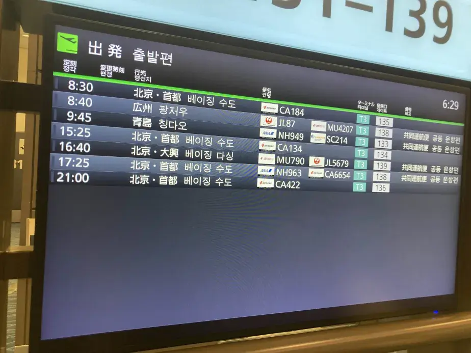手早く出国を済ませる。我々の乗る便はJL87便、広州行き。なんとゲート138番ということでまさかのバス搭乗。