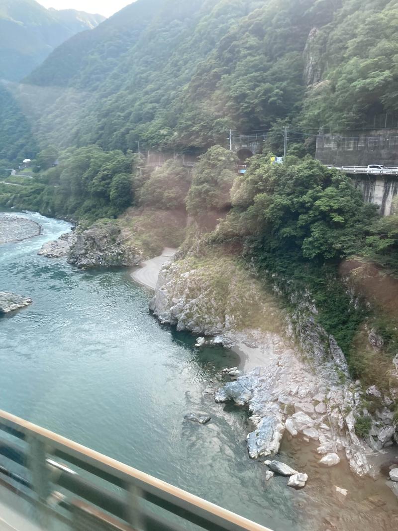 昨日みた大歩危の風景を車内から。谷底という限られたスペースに道路と川がギリギリ通っているのがよくわかる…。
