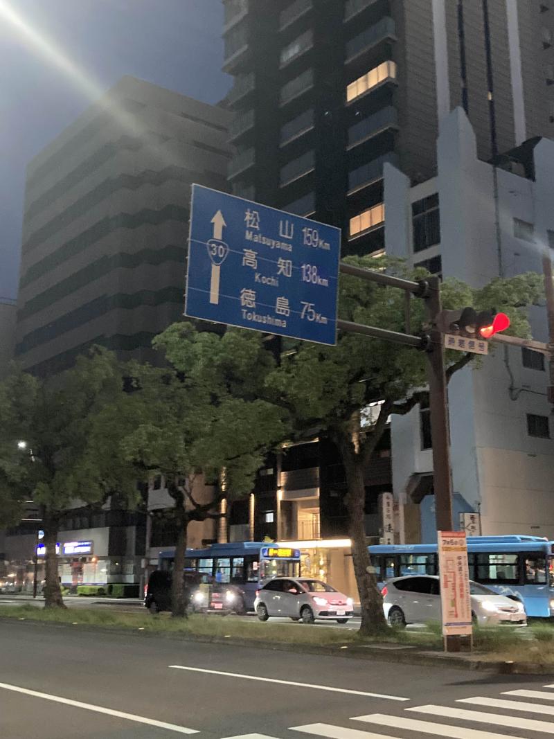高松築港駅へむかっている最中に見つけた看板。さすがは四国の玄関口、高知・徳島・愛媛の各県庁所在地までの距離がかかれていた。高知より松山のほうが遠いんだな…
