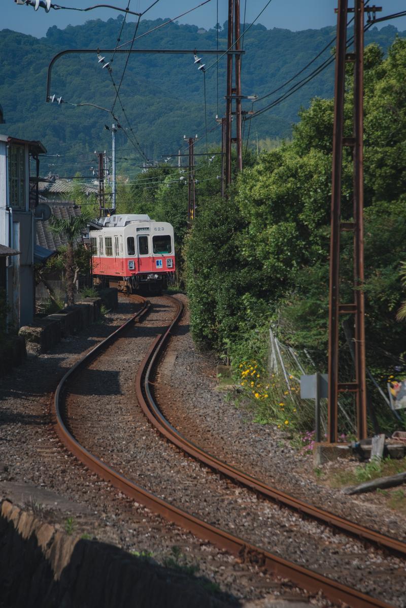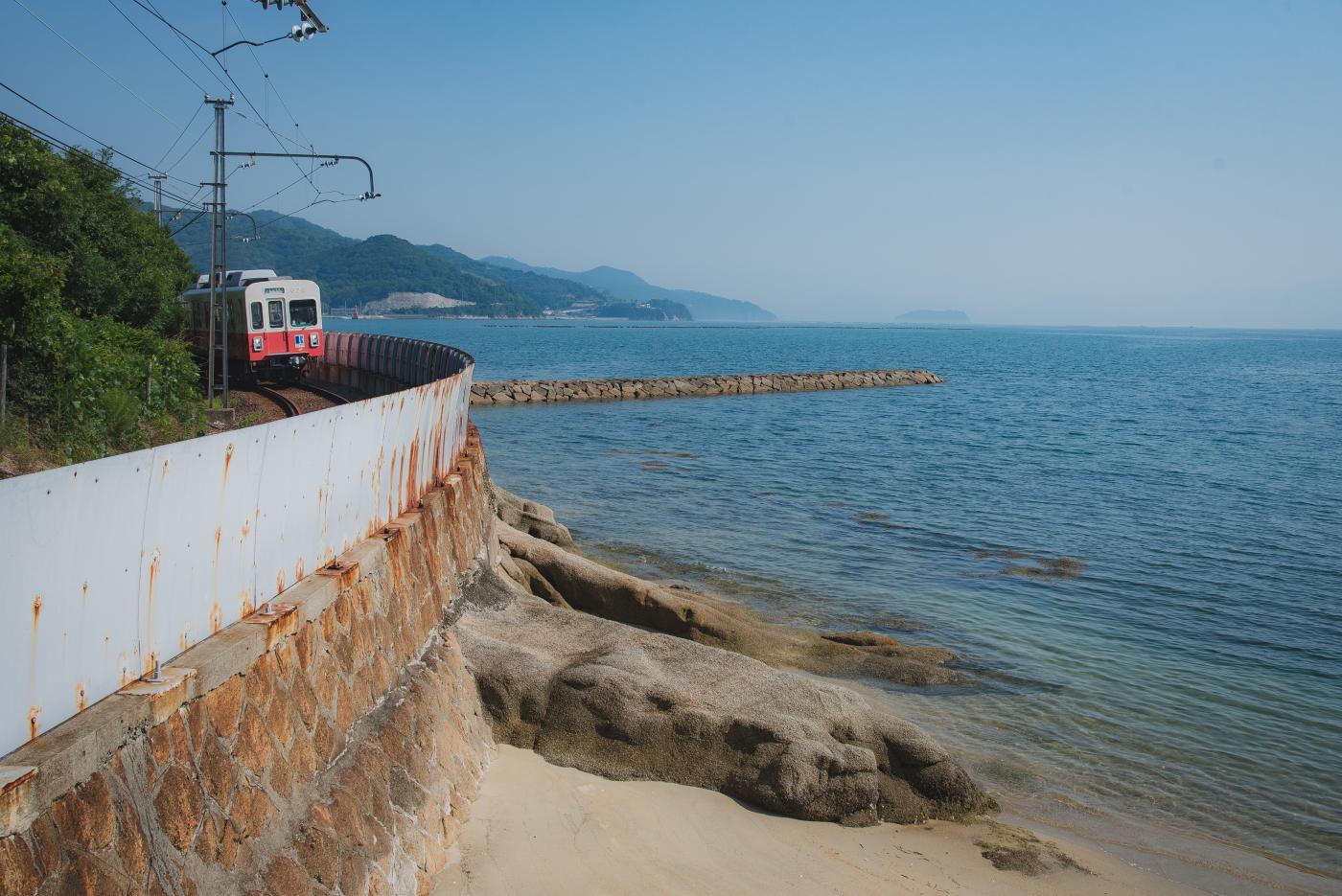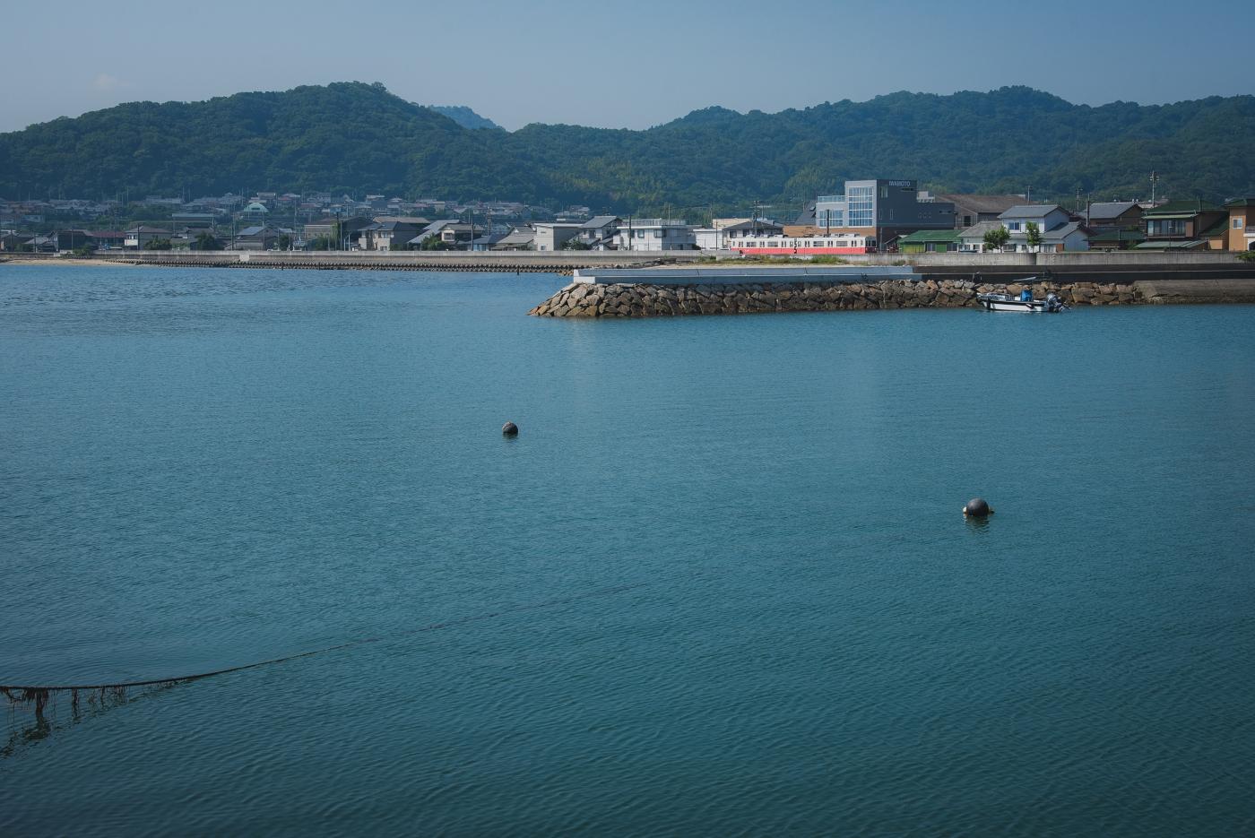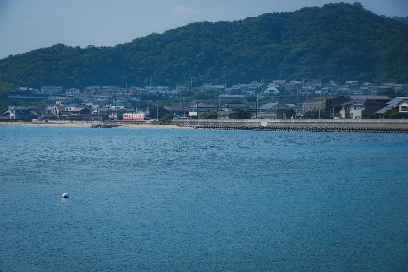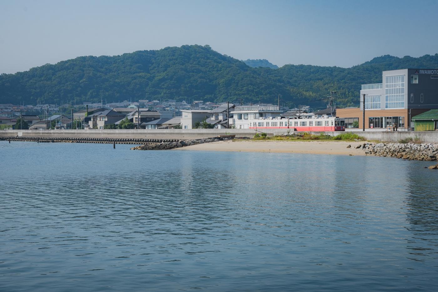 入り江をゆっくり走る志度線。1両あたりの車体長も15.5mでとても短く、かわいい。地味に銀座線の01系よりも小さい。