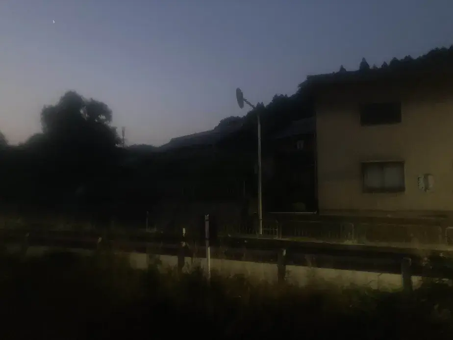 翌朝。目が覚めると3時半くらい。窓の外を見ると、駅間で止まっている。