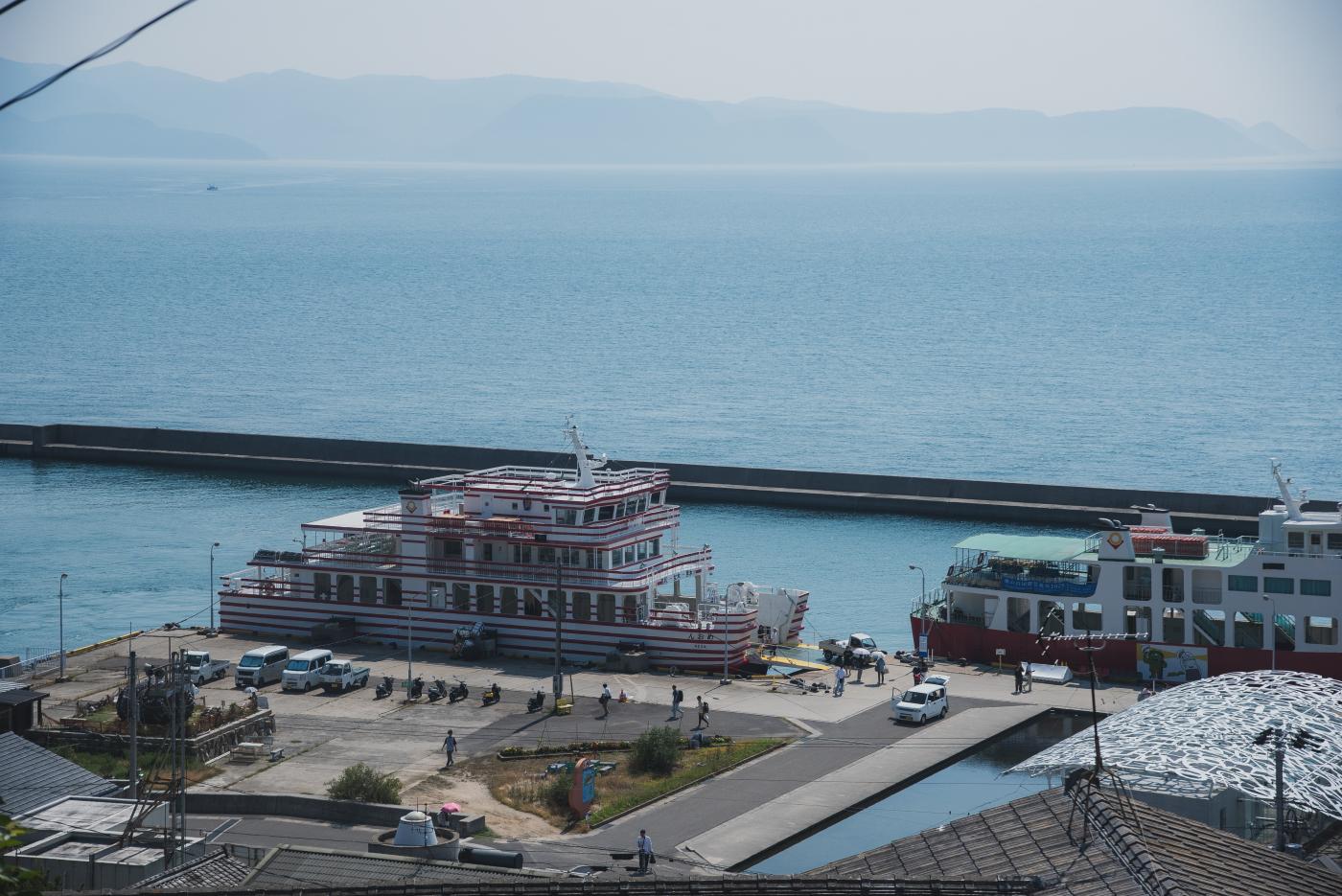 だいたい30分ほどで、帰りの船が入港してきた。奥に見えるのは(ガスっているが)高松市の中心部。