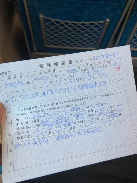 最後は係員からこのような連絡書をもらった。そのままこの紙で品川の改札を出て、会社の最寄り駅まで移動。
