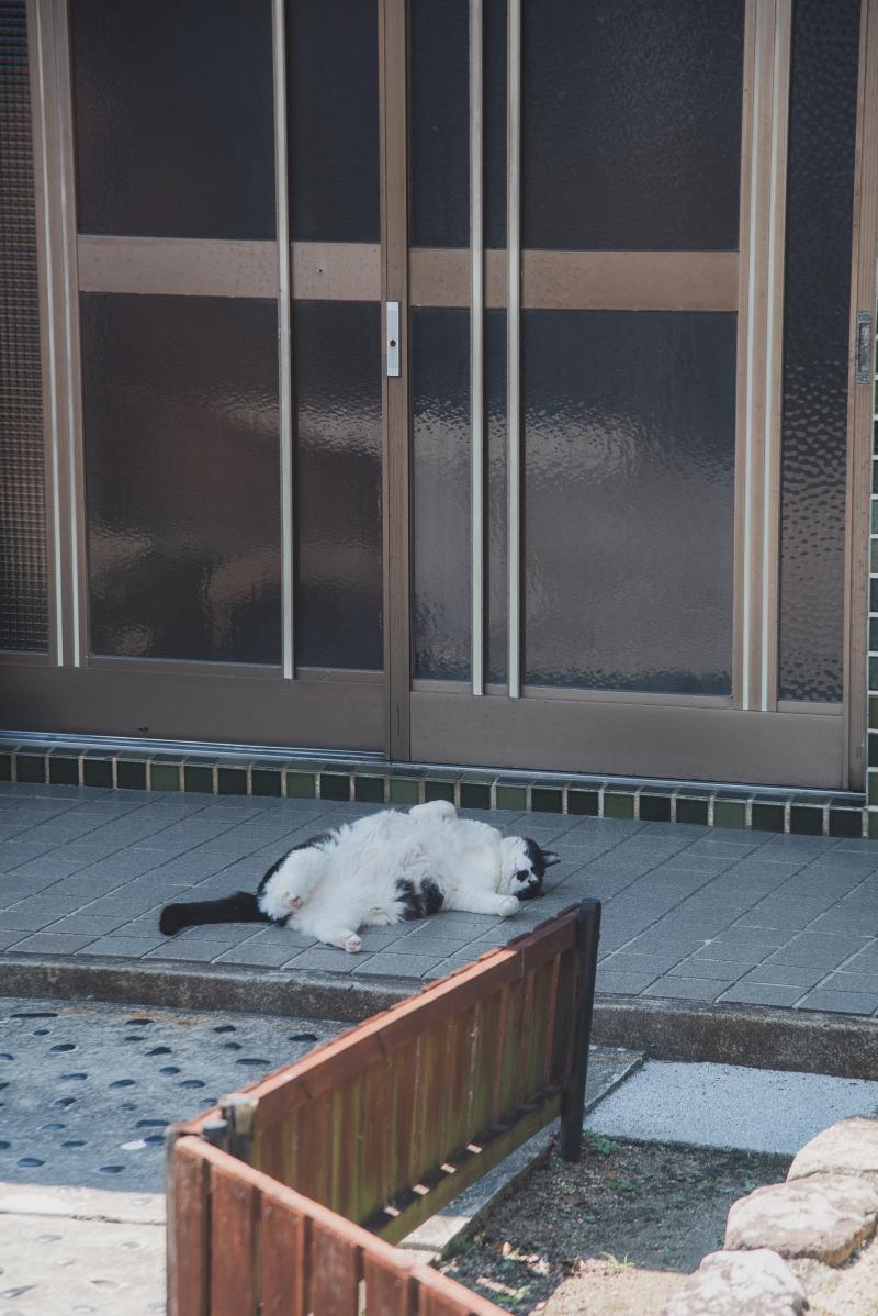 そして男木島の特徴として、とっても猫が多い。いたるところに猫がいて、住宅の玄関の前でもこんな風に我が物顔でお昼寝している。もはや番犬ならぬ番猫?みたいな感じ。とにかく緩い…