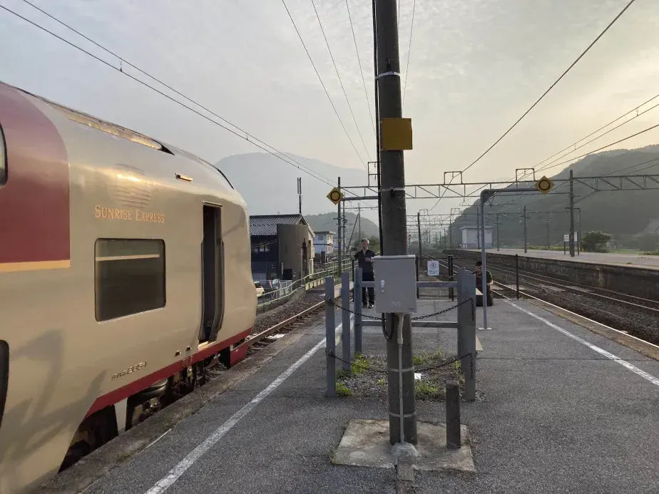 朝日が輝く中、近江長岡に到着。中3ぶりの寝台列車の旅はここで終わってしまった。