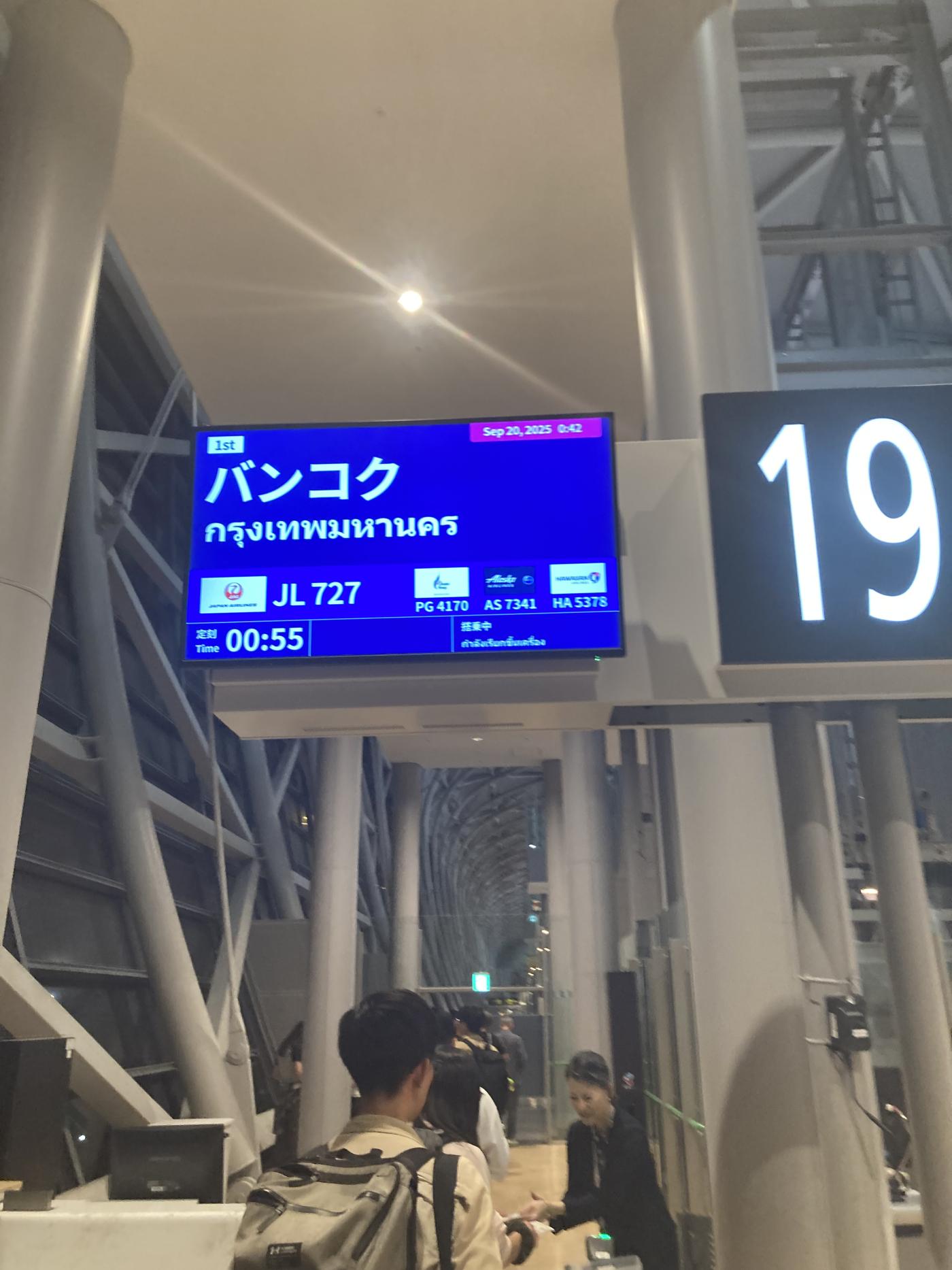 これも去年と同じ、関空からのJL727便でバンコクを目指す。羽田発の直行便だと結構高く、関空乗継だとめんどくさくても半分くらいの値段で飛べる。
