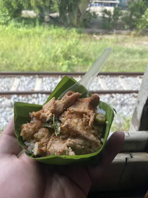昨年同じくトンブリー行の上り列車の中で食べた、肉をナンプラーで炒めたものである。(#8にのってます)