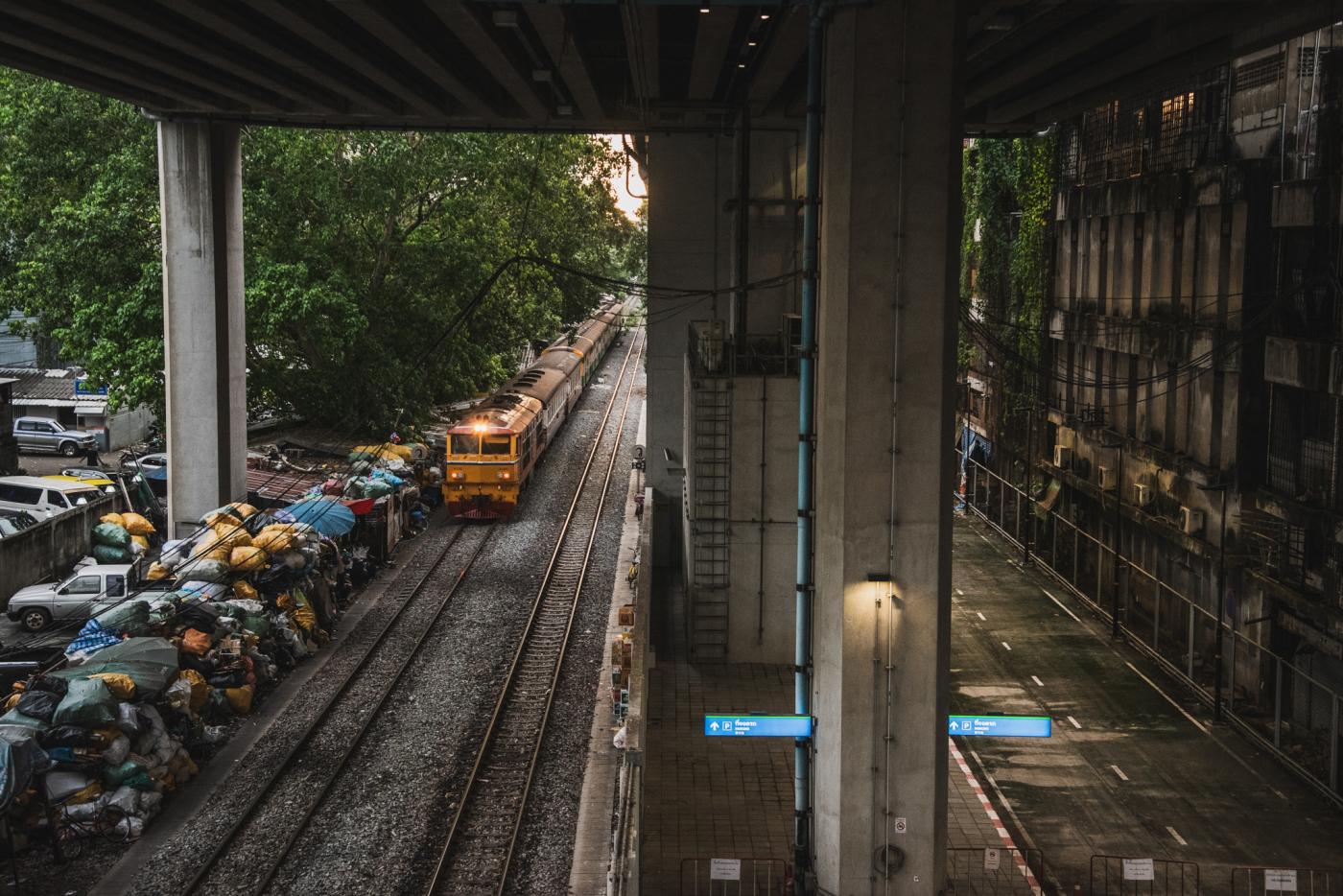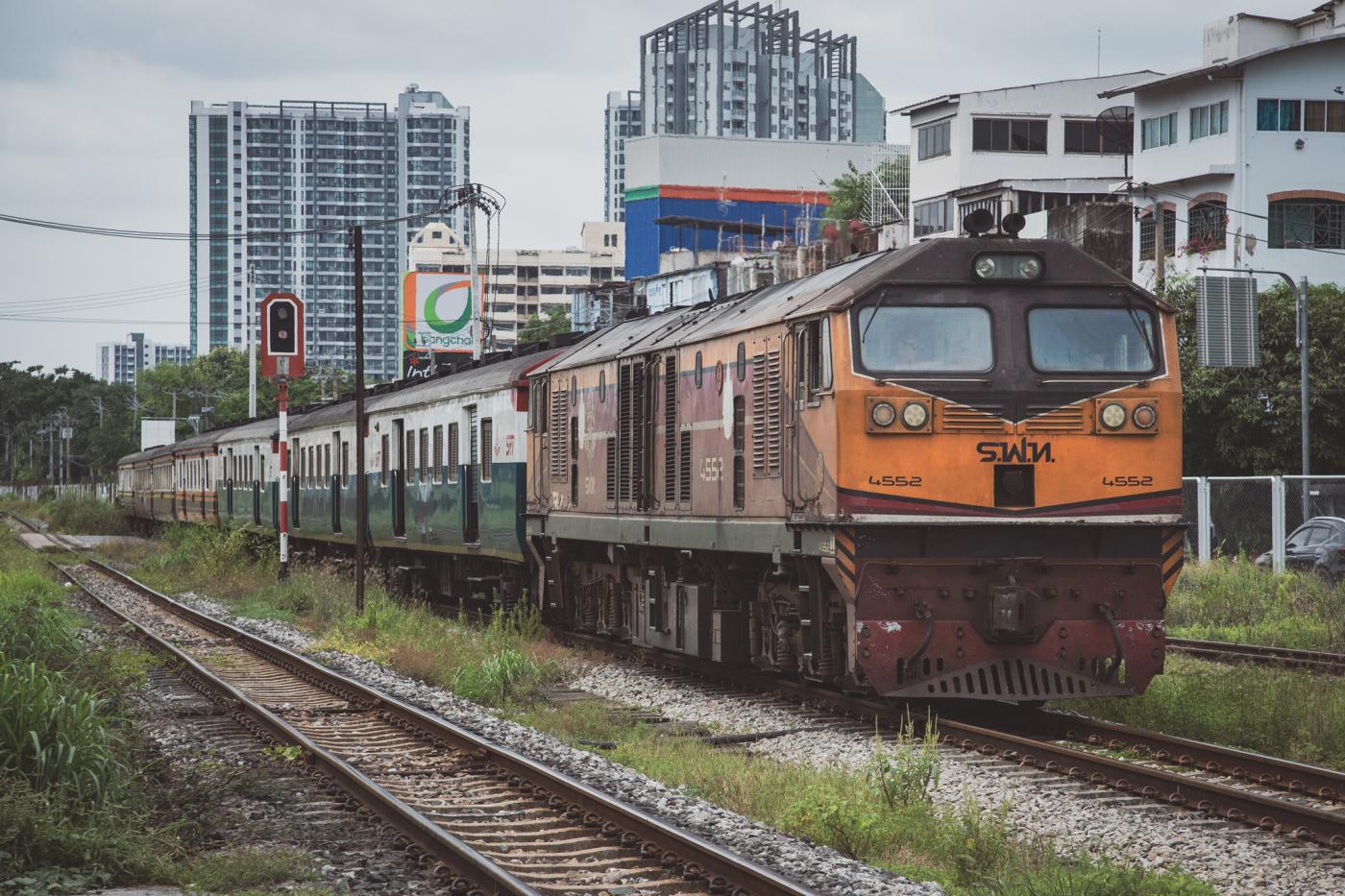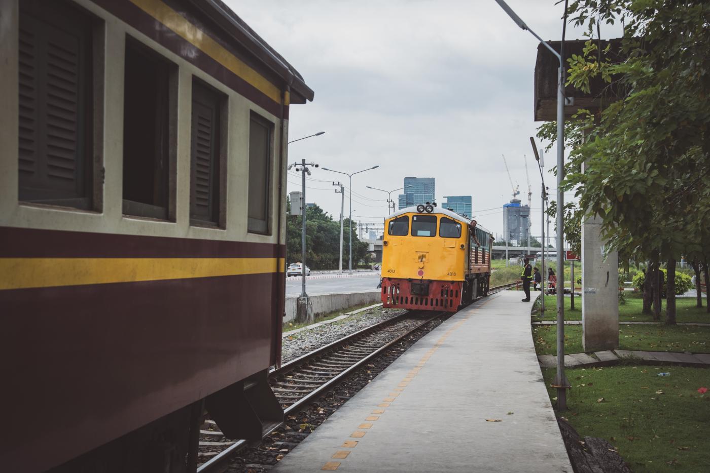どんどん開発が進むバンコク中心部。高層ビルをはじめコンクリートジャングルの風景でもちゃんとタイの客車列車は存在感がある。