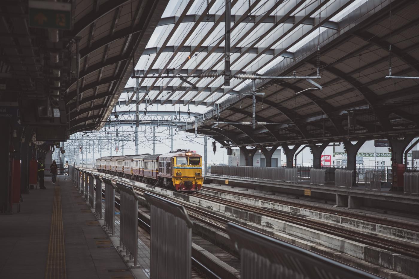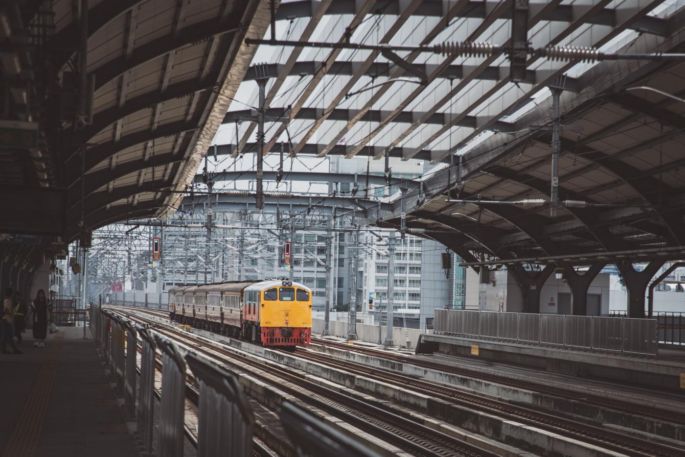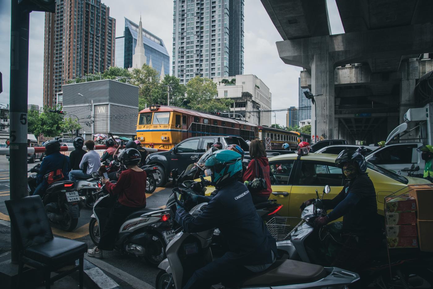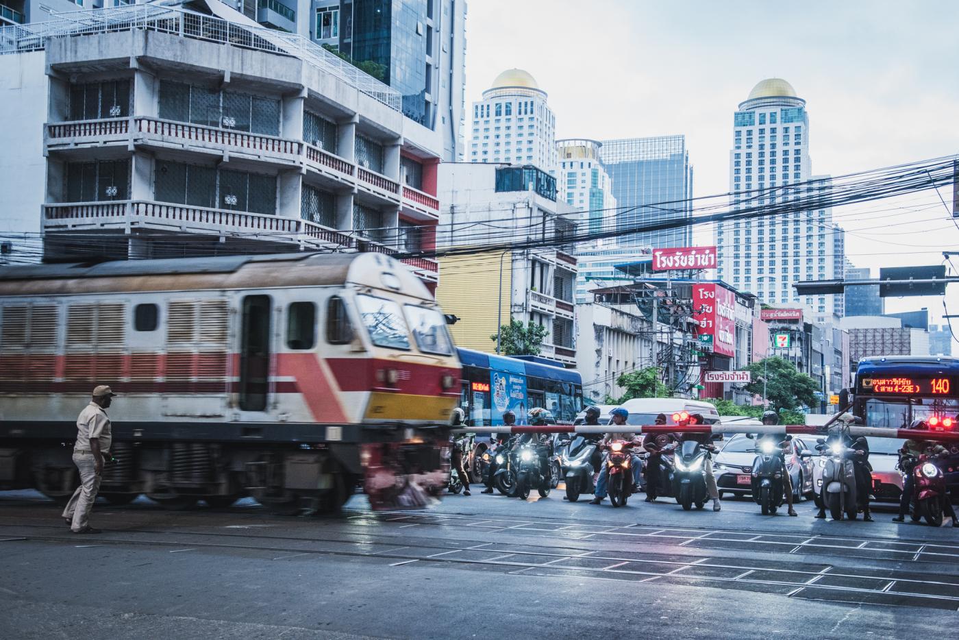 どんどん開発が進むバンコク中心部。高層ビルをはじめコンクリートジャングルの風景でもちゃんとタイの客車列車は存在感がある。