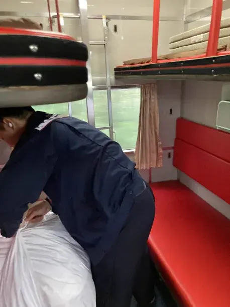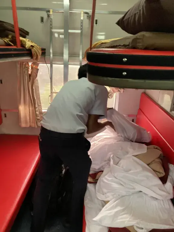 乗務員がやってきてキビキビと寝台を片付けていく。ウドンターニーから先は寝台を座席として使う、いわゆるヒルネ運用になる。
