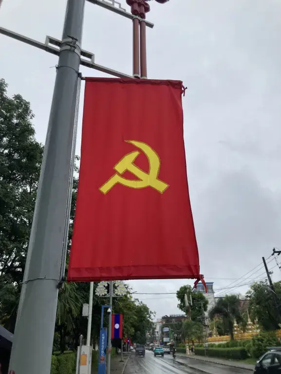 ラオスは国名から察せると思うが社会主義国である。なので通りには至る所にお馴染みの「鍬とトンカチ」のマークがある。こういう旗こそいっぱいあるが、中国の「社会主義核心価値観」とかみたいに街中にスローガンがたくさんあるわけではないのでこの旗以外から社会主義成分は味わえなかった。