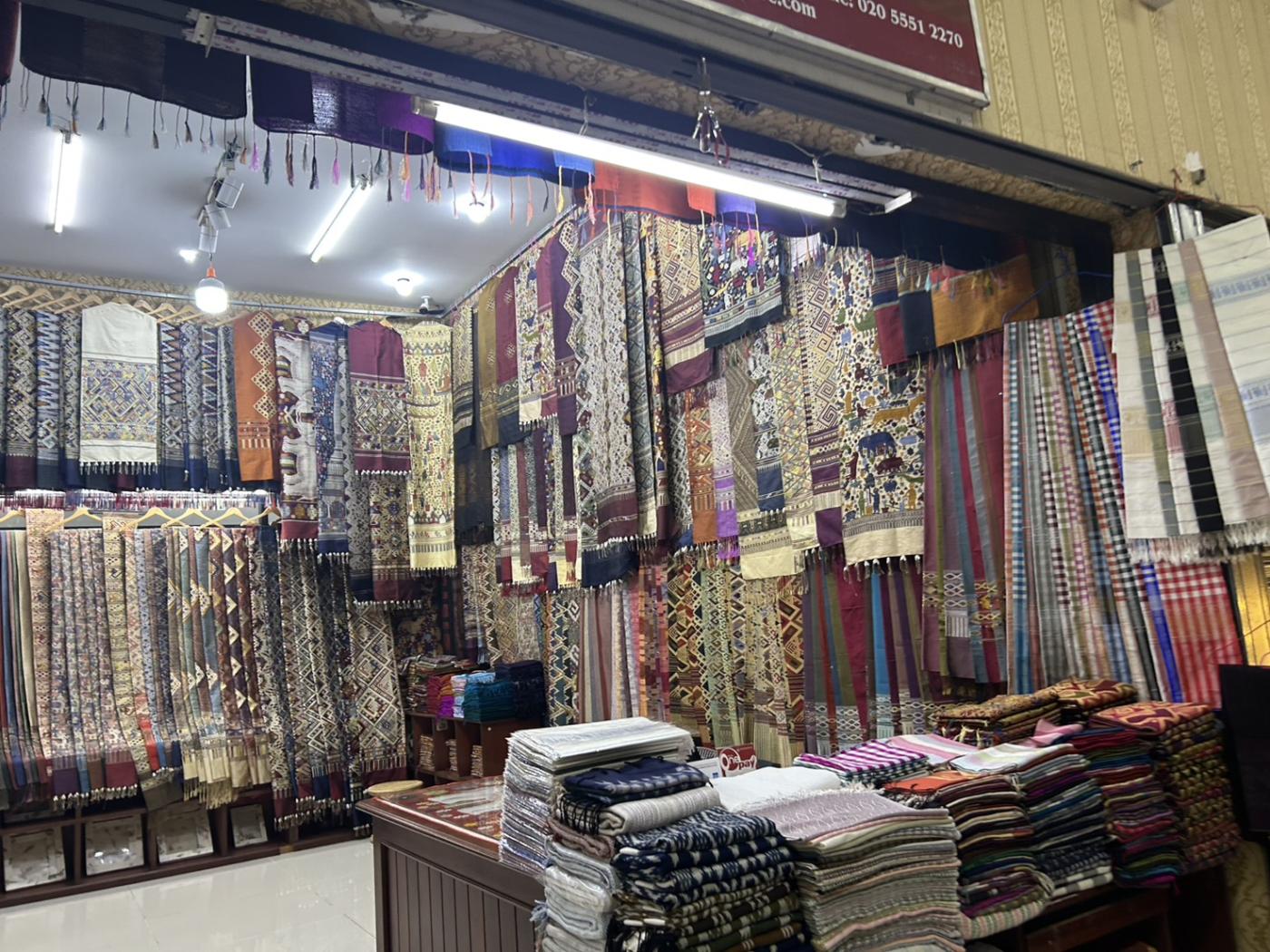 中層階には謎の宝石屋、そしてその上には布屋が立ち並んでいる。ラオスの布はかなり良質なんだとか。布の素材についてはあまり詳しくはないのだが、シルクっぽい見た目をしていた。